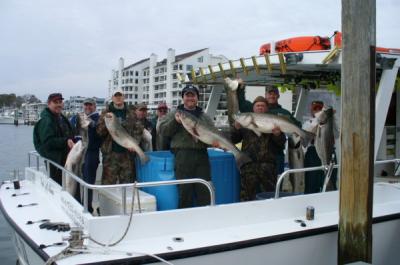 Started out at Cape Henry this morning with four rods bending before the whole spread was set out. Got those four in and proceeded to catch one more fish in the next 30 minutes. Picked up a big bird show on radar approximately 3 miles away and ran to it. This was the real deal. Wide open every line down, every pass. It was total carnage as the boys kept hauling in fish after fish over the rail. Doubles, singles, it didnt matter. Danny, and the crew of anglers got it done in a hurry and kept it going. 22 big stripers and 2 bluefish were in the box at 9:20 a.m. GAME OVER.