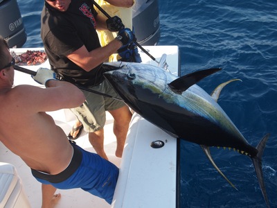 One stud size Yellowfin Tuna got greedy and ate two baits, he had a circle hook in each side of his face, each angler was equipped on 50wides and, well, let's just say that Tuna never had a chance and the fight lasted all of 10 minutes! Of all the cool sights I will never get over a stud yellow waiting in linger below the boat and when John Buck threw a 5" live hard tail the fish hit the small bait on top of the water about 6' from the boat and completely smoked a 30 wide, there is no doubt he would have spooled us if it had not been for the Jerry Brown line underneath the mono top shot.