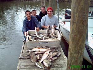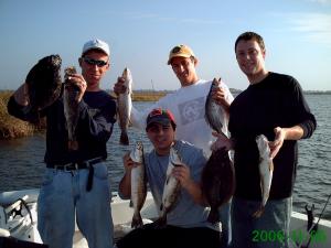 Very good day on the Beach. The weather Monday was forecasted to be iffy at best, but a check of the radar and wind conditions it looked like we would have plenty of good fishing time before the weather turned bad. When I got down to the Beach the winds were low, the sky clear, and the tide high. George Smith and his crew John, Brian, and Kevin met me at Campo's where we filled the live well with shrimp. We headed over to the Hopedale Lagoon area and right away got on a good bite. The guys were pulling in some really nice Trout, and the Sheepshead were thick. When the wind picked up the bite slowed down. We made several moves picking up quality fish at all stops. There were birds both gulls and pelicans every where today and hungry Specks under them. They were not feeding on shrimp, they were feeding on tiny potbelly minnows. When you pulled a fish in the boat it would spit up these minnows and still have a mouth full when you took the hook out. Brian had never caught a fish in his life and started off slow, but before long he was on the fish and ended up catching the most variety and best fish of the day. The Trout were mixed in size and ranged from 12-22 inches. We had many Trout in the 17-20 inch class with a dozen or more at 20-22 inches. Total for the day was 105 Trout, 27 Sheepshead, 4 Reds with many rats released, and 4 Flounder. It was a fantastic day of fishing with a fun group of guys.