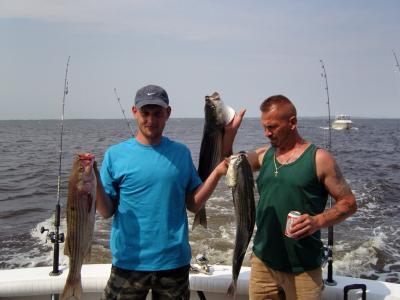 Had a great crew fish with us today Vic Bador Jr & Sr, Joe Fedorchak Chris Buchta and Greg Orz all outstanding fun guys. Started off with a nice pick of Bass then we were puhed off our spot by another boat , It took a while for the tide to turn once it did we returned to our original spot and just hammered them for the remainder of the trip. We finished the day with about 35 bass and atleast that many bluefish.Action was fast and furious for the last hour infact we left them biting. The guys have a few more trips booked and can't wait to do it again.
