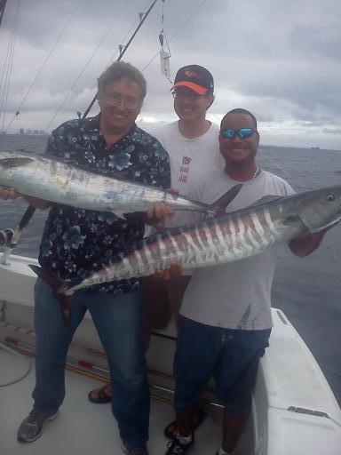 Winds were out of the east northeast at 8 mph, seas running 3-4 ft., temperature was in the mid 80's. We left the dock at 7:30 am and fifteen minutes later lines were in the water as we approached the sea buoy in Fort Lauderdale in 120 ft. of water. We put two plainers down, one with a double hook Bonito strip with a green and white sea witch and the other with a black and purple sea witch. For surface baits we had four Ballyhoos and a Ballyhoo daisy chain teaser. With the fish gods on the angler's side, we started off with a bang, catching one Kingfish after another after another, winding up with eight Kingfish, which we kept and releasing 18 Kingfish. From there I could see some birds working the area off shore, so we trolled towards the birds. As I got close I could see a school of Mullets migrating to the south, which is a good indication that the predators will not be too far behind. We wound up catching four Tunas and two Bonitos in this area.