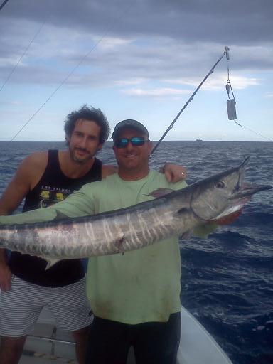 We started off with two #8 plainers, one with a 3 ½ blue reflector drone spoon and the other with a double hook pink and blue sea witch in front of a Bonito strip. For surface baits we went with two Ballyhoos and two Bonito strips. Our first fish was a Kingfish, and James was our angler, while Mark and Matt cheered him on. From there I headed towards one of our 34 artificial wrecks. Upon arriving, I took one engine out of gear so that the baits could sink down deeper – it paid off because Mark caught a 25 lb. Amberjack. I could see some birds working the area – east of Fort Lauderdale - so I headed towards the area. One of our plainer rods got a strike as the rod tip bounced up and down – a tell tale sign that it may be a Wahoo – Matt was our angler. Ten minutes later, Mark our mate, gaffed the jaw snapping Wahoo, weighing in at 26 lbs.
