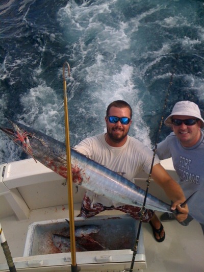 Fishing in Ft. Lauderdale in August, especially on the moon, offers opportunities at a very welcome and special fish as the one pictured here aboard the Marlin My Darlin. And that fish is the Wahoo. We catch them in the summer offshore around floating objects and edges as we have said in earlier reports, but August often has really nice fish right up @ the reef line only a mile or so off the beach.