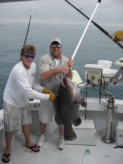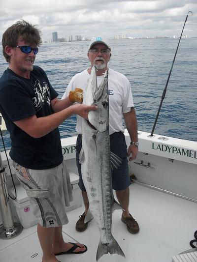 Jim, David, Jesse and three others joined the Lady Pamela II for a shared fishing charter in Fort Lauderdale, Florida. With six different people on board, everybody wants to do something different, so that was our plan. We started with trolling gear in the water, catching King Mackerel and Bonito fish. Then we relocated with live bait looking for a Shark bite and ended up fighting a Warsaw Grouper. Our last pit stop was to a wreck with a live Bonito and a Barracuda ate. What a day.