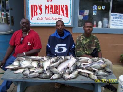 Crappie fishing is Great. The Crappie are shallow and in the late stages of spawning. The fish are on the banks in the mid to lower lake, casting a Jiffy Jig in color JJ17 to rocky banks and under docks is working awesome right now. In the upper lake the fish are in 3-5 feet of water in the back of the spawning bays, Trolling a Jiffy Jig in 1/24 ounce in colors JJ13 and JJ17 will produce some hot action. Fishing shallow brush piles with minnows is always a great way to catch fish during the spawn here on Weiss lake. Cowan Creek is still producing some good catches trolling 1/16th ounce Jiffy Jigs in 7-10 feet of water. Bumping bottom with minnows in Little River and the Chattooga River is producing some good catches also.