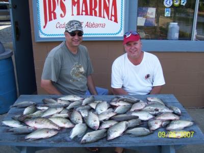 Crappie fishing is Great. The Crappie fishing has turned on with the cooling trend over the past weeks, A lot of 60 fish limits have been coming into JR's Marina over the past week. The crappie are on the main Coosa River and other creek channel ledges. Bumping bottom in 8-12 feet of water with live minnows and Jiffy Jigs is producing some good fishing. The bumping bottom technique is a 1/2 to 3/4 ounce bell sinker tied to your main line then come up 12 to 16 inches above the weight and tie a eagle claw snelled hook in size 1 or 2 style # 127 to the main line, fish this rig 1 to 2 feet above the bottom on the old Coosa River channel in the Bay Springs and Yellow Creek area. Shooting docks that are on the main Coosa River channel with a 1/24 ounce Jiffy Jig in color JJ13 is still producing some good catches.