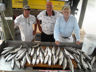 Bob Hiess, Al, and Kit were right on time yesterday morning to get an early start and try to beat the heat. I was little late I was making sure we had live croakers along with the shrimp because Sunday all they wanted was Croaker. Well today all they wanted was live shrimp that is why you need to have both when you can. Surprisingly the wind was up from the NW this morning with1to3 footers in the bay. First 2 stops nothing but we got few going on our third rig. Slow bite but nice speckled trout 0or so on ice and they quit and so did the tide. Made a few moves and found some more with live shrimp under corks along the shoreline and the box was looking good. The wind went flat and broiler kicked in, the guys were getting hot and looking WELL DONE! so we called it a day and headed in. Stooped on some birds in Lake Robin and caught half dozen schoolies to top things off. Great day.