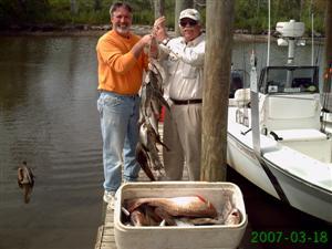 What a difference a day makes. Sunday morning conditions were ideal unlike the day before. It was nice and cool, clear, and no wind. Mack and Bob hoped on in an off to the Sound we went. At our first stop Bob started fishing with a Top Dog Jr. and right away the water blew up and a Trout slammed his bait. Bob pulled in a nice 3 pound Trout. Fishing with both Bayou Chubs under a cork and with the Top Dog the guys put some nice Trout on ice before the tide stopped and so did our bite. We made a move and got on a good bite of some monster Sheepshead along with Drum and Reds fishing with shrimp on the bottom. Before long the fish box was full and off to the house we went. Capt. Frank fried up some of the fish for the guys while the rest of their fish were being cleaned. It was a great way to cap off a fun day of fishing. Total for the day was 21 Trout, 2 Reds, 1 Pompano, 3 Drum, and a load of Sheepshead.