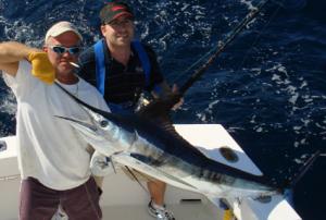 September 29th, 2006 We caught and released one white marlin and lost another one on a 12 hour offshore big game trolling trip. We enjoyed a beautiful day on the Alabama Gulf Coast while fishing and listening to college football on satellite radio. We had Alabama fans and a Florida fan. Thanks to David and his group from Winter Haven, Florida. They had bottomfished in the past and wanted to try some offshore trolling.