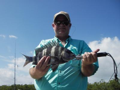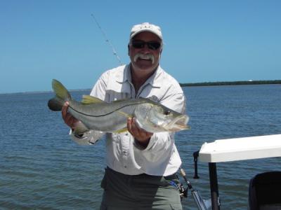 Fishing has continued to improve in spite of the howling winds of late March and early April.Starting out on Monday the 31 st of March fishing with Jason Pollard we boated 8 Snook up to 27" and a mess of Ladyfish in th PM. All fish were caught on DOA shrimp and Yo-Zuri 3d minnows.On the 1st of April Jim Brown and his son and daughter Andrew age 8 and Gillian age 5 spent the morning together catching Ladyfish and Trout to the tune of about 50 fish.Then on Wed 4/2 i fished with Jim Allen and John and once again caught a mess of Ladyfish and 25 or so Trout up to 3# as well as a couple of Snook with 1 being 27" just a hair short. All of these fish came on DOA shrimp Cal tails and and 3d Minnows. Out again on the 3rd with Jim Brown again , this time we only threw the flyrod and had varied success with a bunch of ladyfish 2 Trout with one going a couple of pounds and 2 small Snook. We also Jumped a 20# Tarpon for a little added excitement.Fisishing up on the 4th with my good buddy and longtime customer George Vogel we Had a decent day with 40 or so Ladyfish a few Jacks 10 Trout , 10 Snook up to 29" and a Sheepshead on a Doa Shrimp. All these fish came on DOA 1/4 ounce Shrimp and Mirro lures. Can't wait for the wind to die !