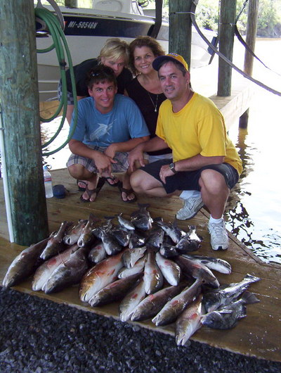Glavan family Kenny, Lisa, and Kenny Jr and Toni had one tough day to fish in 20 -25 mph winds Saturday. But it was Lisa's birthday and mom wanted to go fishing so fishing we went. Well with the wind going outside for trout was out of the question so it was to Be a day in the marsh cashing reds and drum and everything else. Thing started good first stop a couple of drum and one red. But it got slow for awhile the wind was getting worse so I had to hit the really small protected places. But we found the reds and drums hungry on a small drain out where the box started to look good. Worked around several ponds and drains picking up a few at each. Finished up on a good note with some of the day's biggest reds along with some more drum. BEAUTIFUL BOX of fish for the day.