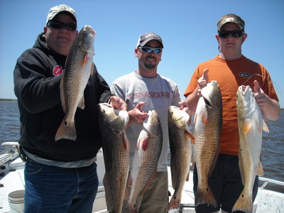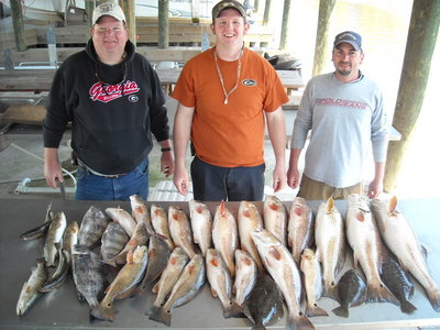 Knew it was going to be tough day with 20 to 25 mph West wind and Low tide, But Alan, Justin, and Jason had planned this trip months ago and came from Georgia to fish so we were going to fish and do our best. Things started out good first area 2 reds in the boat. Several stops and few hours later we only had 3 reds and a flounder. Wind was howling and dirty water everywhere. Told the guy's we were going to make a big move deeper in the marsh and find some cleaner water. Got some better water couple of spots not a bite then we hit pay dirt. Clean moving water tide falling out of a drain fish on a nice red finally at 11:45. We stayed right in that area only moving the boat down the bank a little and filled out our limit of reds along with few trout ,drum, and 2 flounder, Talk about a down to the wire finish. I have to praise Alan, Justin, and Jason they fished hard and did not com-plain about the conditions and were rewarded with box full of fish. All fish caught with dead shrimp or live minnows under a cork.