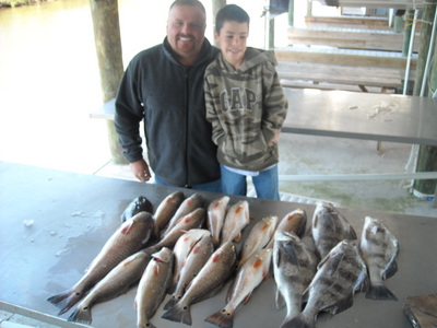 John Bindewald and 11 yr old son Blake on board today for some red fishing action in Hopedale LA. A cold front blew in last night and had it kind of coola and windy this morning but that would not be problem. First stop two redfish on ein the box the other too small back overboard. A couple more stops not a bite but we kept at it. Found some reds feeding off a point out of the wind Blake was first to hook up then John and the reds were hitting every cast for awhile we put 10 in the box and that many released. Two stops later and the limit was full along with a few drum and a flounder. Great day and back before noon. All fished caught on dead shrimp under a cork