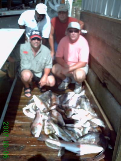Windy fun Saturday on the Beach. I had four fisherman from the large New Orleans Flooring group that came down to the King's lodge, Glen, Marty, Troy, and Harold. As it has been for the last 2 weeks now the east winds were blowing hard and the water was high and rising. The tide never did fall against that stiff wind all day long. We headed off into the Biloxi Marsh after a stop by Campo's for bait. We started off near St Malo making few stops with little to show for. We moved on in deeper above Stump Lagoon where the guys started to put some fish in the boat. Lots of throwback Trout, but the keepers were really nice, up to 3 pounds. Got on a good school of Reds and the guys had a blast with them. They had a great time and filled up the fish box. All fish caught on Campo's live shrimp under a cork. Total for the day was 45 Trout, 12 Reds, 4 Drum, and 2 Sheepshead.