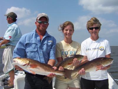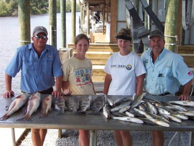 Larry Romero and Family! Wife Pam daughter Laura and Son Cecil were met with some very windy conditions yesterday morning. So I headed to the protection of the interior marsh and first stop were on the trout. Tide was pouring in with birds diving and shrimp jumping and trout on almost every cast; but a lot throw backs with a few good fish mixed in. We dodged the rain by running back to the dock for a while then back out again. The trout were to be small all day but steady action. Got into as few reds and drum in some deep water but the bite never really turned on. Finished up in a protected lagoon out of the wind putting some more legal trout on ice before caiiling it a day around 12:30.We did well despite the wind and a good time was had by all. This was Laura's first trip and she was doing pretty well against the fish machine Cecil. Larry always fishes hard and Pam was taking it easy just enjoying the day catching fish.