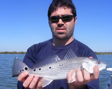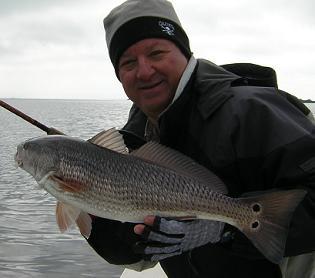 December 2010 has brought early winter conditions to East Central Florida with several below freezing nights and very cold water temperatures before the first day of winter. I am pictured with a frosty morning Redfish taken on a scouting trip right after the cold spell began. After the Reds and Trout got used to the cold water temps down in the high 40's and low 50's on the cold mornings, our early winter pattern of schooled up fish in the sand sloughs and pockets began to be the go to fishing style. On the beautiful sunny post cold front days we are also finding larger sized Redfish schooled up on the shallow flats looking for some warmer water in the sunshine. Lately I have had several charter trips with catches of 50 to 100 plus fish, mixed Redfish, Trout, and a few Flounder mainly from the sand sloughs. Most of the Reds have been "fun to catch on light tackle", smaller fish around 15" to 20", but many of the Trout have been quality fish up to 17" to 20", with lots of smaller sized mixed in also. These numbers of fish are exceptional for fun catch and release fishing, but the Seatrout season will reopen after New Years Day so we can start to keep some for dinner again. The trip catch numbers of fish will begin to be lower at some point through the winter as the big totals as of late are the exception not the rule. But fun fishing will continue here on Mosquito Lagoon and the Indian River. The other picture is client Steve from Connecticut with a beautiful 14 spot Redfish.