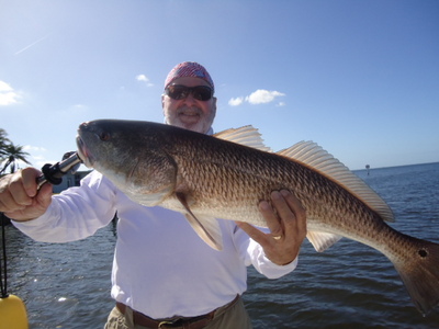 Next up we targeted docks and the fun began. Again the first bait in did the trick as I saw Jim's rod bend deeply. I first thought he was hung but quickly discovered he was on a big fish. It was 5 minutes before we got a look at a thick redfish well over 30". The Red saw the boat and went ballistic. A few minutes later it was high fives and pictures time with a 34" redfish.