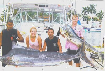 A result of this has been the number of Black Marlin and Blue Marlin that are being boated in the usual places of Corbetena and El Banco. Just yesterday, there were six boats at Corbetena, the least amount of 'Hook-Ups' for that day was three and the most was six hook-ups per boat! When you've got that sort of action, then the fishing is good by any ones yardstick, Now matter how jaded you are. The Marlin is worth paying attention to especially since they're running between 350 to 800 lbs. Sailfish are also here, but it seems they've bowed to Marlin as the predominant game fish in the area'
