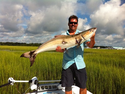 By mid to late May the Cobia start to show up around Wrightsville; one of my favorites and will run good until early July most years. I look for Cobia around inlets, shoals and bait schools; near shore/offshore reefs and ledges are also a good place to look too. With the water being so clear it has been easier to see those brown logs in the water. We are throwing big jigs, swim baits and live bait to the Cobia. Color really does not seem to matter; but "go bright"! When I'm not sight casting for them, we are fishing around inlets, shoals and near shore artificial reefs. I float fish, bottom fish and kite fish in these areas with live menhaden, blues and mullet as bait. Sometimes a great bonus fish when fishing for Cobia is a nice bull Redfish. You can chum if you like, but the sharks and Rays will come and they will come in numbers!