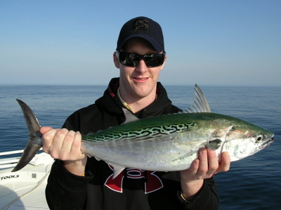 When the Bonita and Albacore are on top feeding; cast Maria and Sea striker jig-spoons. The colors that seem to work the best are pink, green and blue. I use a forty pound Fluorocarbon leader; about fifth teen to twenty inches long. I really like Stren's tinted (gunsmoke) fluorocarbon leader material for clear water conditions; "this stuff really works"! A light weight 7' rod and a Penn Battle 3000 loaded with ten to fifth teen pound braid is important for casting to these fast fish. The reason for this is the further you can cast equals more chance's you will hook up. When there are a lot of boats chasing the Bonita, they get wearer of boats. If you can cast farther; you will catch more of these fish!
