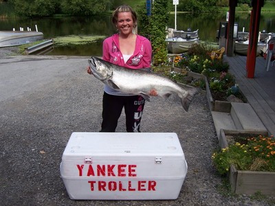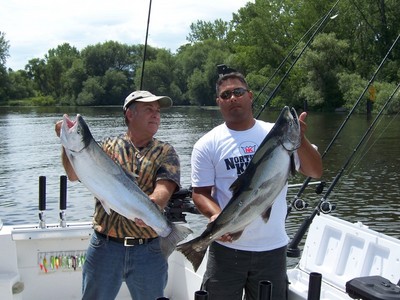 8/17 - We got out early with hopes of getting a good inside bite. We knew with a light crew we weren't running 8 miles out again given the conditions. The picture was spotty until we got down east a tad ,and there we found bait with fish mixed in as well. We worked 120-140fow most of the morning. Sea sick Waddlers were our #1 lure today on our 100 rigger, which happens to be the set-up that took a 30.03 Salmon for us today. He hit the NK Mag Waddler 5' above the 28. Other rigs today were the 42nd combo on a wire dipsey, White/Purple Spinny pulling a purple mirage A-TOM-MIK fly, #3 Green glow j-plug on the 300 copper, and a hammertime spinny pulling a glow pro am A-TOM-MIK fly on the 600 copper. We didn't do numbers today, but a big 'ol fish makes up for half the bites ya been getting. Thats our first fish on the Fall LOC leader board. Two weekends left to go!