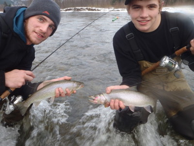 Dec 16 Ariel Kuppers and Justin Lowes hooked 19 Trout and landed 8. They were fishing with a Gibbs http://www.gibbsfishing.com/ Float and the "Kitimat Combo" which is a 3" Berkley http://www.purefishing.com/ Power Bait Worm and a Dew Worm from Bubba's Bait Barn http://www.bubbasbaitbarn.com/ . Ariel also hooked a few with a "Pink Worm" pattern that he had tied. Ariel was using a Dragonfly 9' 8wt Rod with a Dragonfly Expedition Fly Reel made by Redl Sports http://www.redlsports.com/ . He was using a Scientific Angler Sink Tip Fly line and Cortland http://www.rapala.ca/ backing. Both Ariel and Justin were wearing fleece made by Simms http://www.simmsfishing.com/ . Well done guys. Congratulations!
