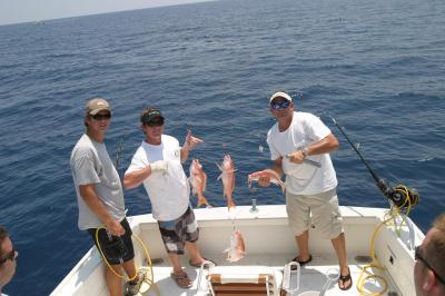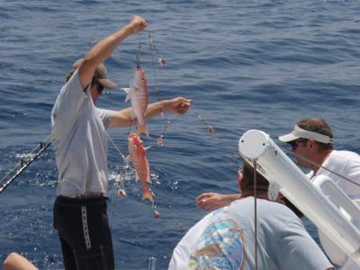 We knew of a great yellow eye snapper spot, so we decided to go deep dropping in 830 ft of water. We fished with two electric 130 LP reels, 15 hooks per reel. It took aprx. three minutes to hit bottom, and it was a instant bite. We averaged 8 fish per drop. We reached our limit in no time at all.