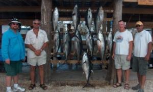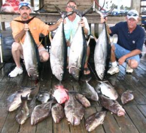 anyway, Scott was able to spear one 4# tripletail..spent the remainder of the day dodging wind and rain..made a halfhearted attempt for tuna just before dark striking out..got set up for 2 sword drifts getting one bite on each..fish 1 dropped the bait on strike one and hook pulled when we came tight on strike 2..headed in about 11pm, missing the storm of the century by an hour..Took all of Thursday off to rest up and came back with a vengeance Friday with Terry, Ronnie and Dan from Longview TX..spent the morning (or wasted the morning) looking for a tuna bite that wouldnt happen..too much traffic and no fish..about 1030am we put out a trolling spread and tried for a dolphin..still nothing working we picked up and would make a stab at the grouper and jacks..managed 10 scamps, 2 jacks and a decent snapper before deciding on tuna again..were lucky to find them cooperartive and we added 4 yellowfins to the box..3 on the spinning rod...